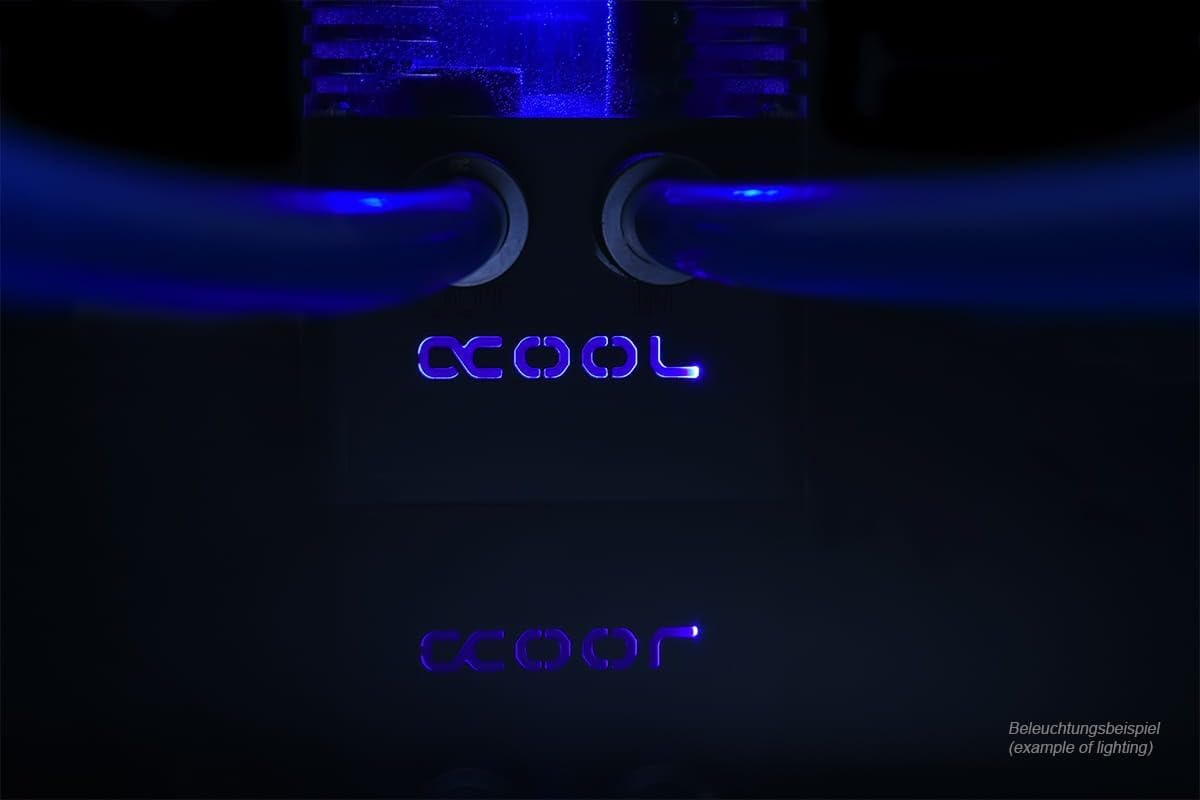 With the Alphacool ice station you get a compact expansion tank that can fit in almost any housing. The ice station is available in three versions: the DDC, D5 or DC-LT version. This version includes D5 VPP655 PWM pump.With the Alphacool ice station you get a compact expansion tank that can fit in almost any housing. The ice station is available in three versions: the DDC, D5 or DC-LT version. This version includes D5 VPP655 PWM pump. Note: The Alphacool VPP Apex pump (13339) is not compatible with this expansion tank. Illuminated logo and LED mounting options Mounting optionsIt is possible to screw the ice station onto a 2.5" mount for SSD hard drives . Installation in a 3.5" bay is also possible. In both cases, the screw connection is carried out using the special decoupling screws provided. This minimizes the transmission of vibrations to the housing and makes operation significantly quieter overall. Another mounting option is an included Velcro fastener. Connection options Each IN and OUT with G1/4 thread can be found on the head side with the illuminated logo. A G1/4" and a G3/8" connection are available in the lid. The G3/8" connection makes filling the ice station easier due to its larger diameter and can alternatively be used as a lighting module for 5 mm LEDs. A special highlight is the choice of material for the ice station. The lower part is covered with a high-quality soft-touch surface, which provides an outstanding feel and look. The upper part and actual expansion tank is not made of simple and easily broken acrylic glass but rather of extremely sturdy nylon. Technical data Dimensions (L x W x H): 102x82x105mm Material: Nylon/PMMA Filling quantity: 250ml Thread: G1/4" Connection options: 3x G1/4" / 1x G3/8" Lighting modules: 4x for 5mm LED Color: black/transparent Model: 13798